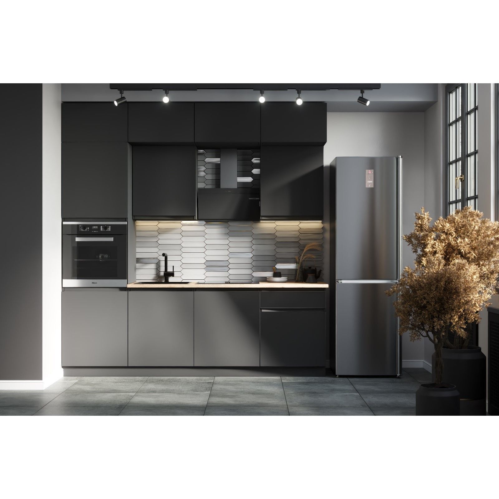 Кухонный гарнитур Виктория отличается не только эстетически привлекательным дизайном, но и высоким качеством материалов и сборки. Прочные и долговечные фасады, выполненные из современных экологичных материалов, устойчивы к царапинам и ударам, а также легко поддаются чистке. Цвет графит придает гарнитуру стильный и современный вид, который будет гармонично сочетаться с различными оттенками элементов вашего кухонного интерьера. Вытянутые до потолка шкафы позволят спрятать все кухонные принадлежности, оставив пространство свободным и незагроможденным.